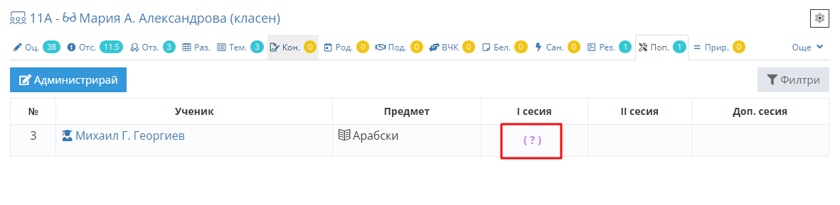 8. За да въведете резултата от поправителния изпит, навигирайте отново до секция "Поправителни изпити" (Поп.) в съответната паралелка и кликнете върху лилавата въпросителна -> "(?)"