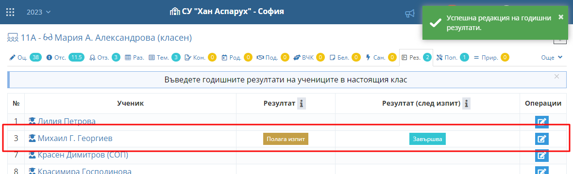 След като запазите промените в колона "Резултат" ще се изпише "Полага изпит".