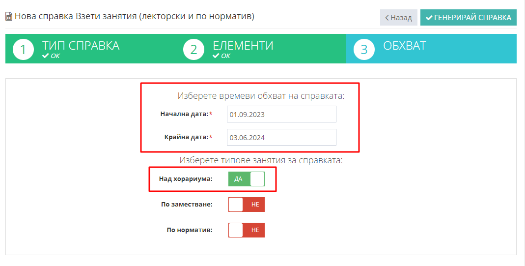4. Задайте обхват на справката и изберете "Над хорариума:" да бъда "Да".