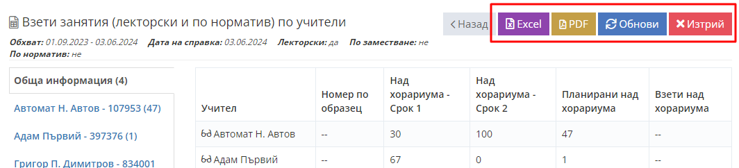 Тя съдържа както обща информация за брой проведени лекторски часове над хорариума, за тези по заместване, така и ви дава информация за конкретен преподавател.