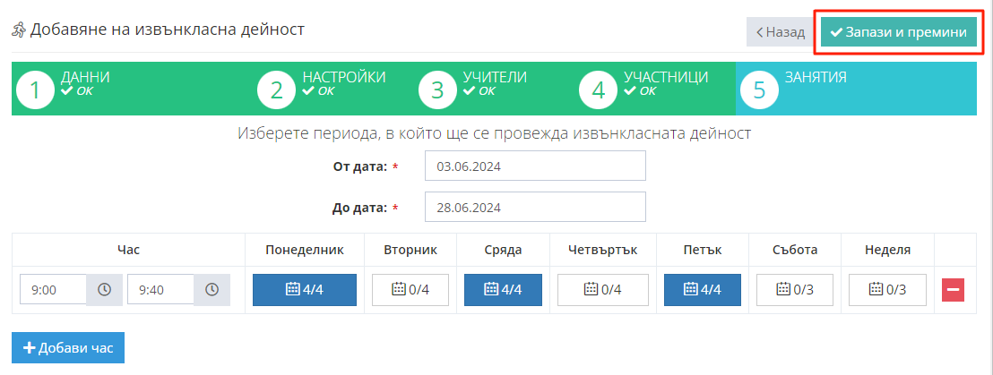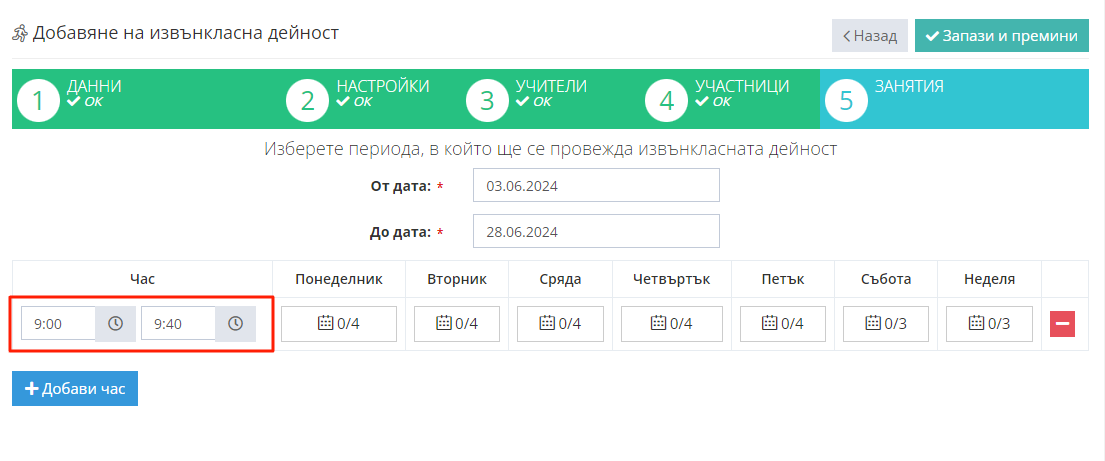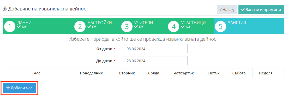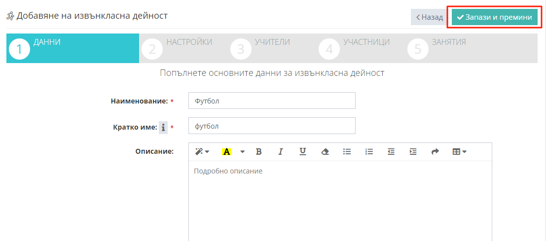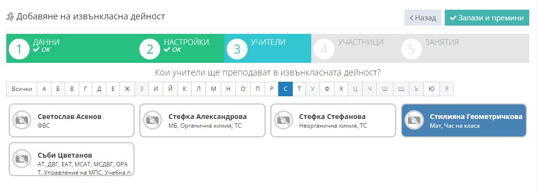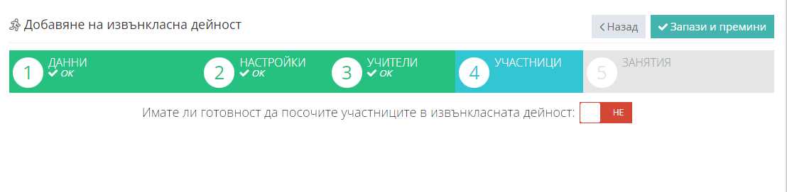 7. Може още на етап създаване на извънкалсната дейност да добавите участниците, в нея, но може и да го направите на по-късен етап. За да преминеттте към следващата стъпк акликнете бутон "Запази и премини".