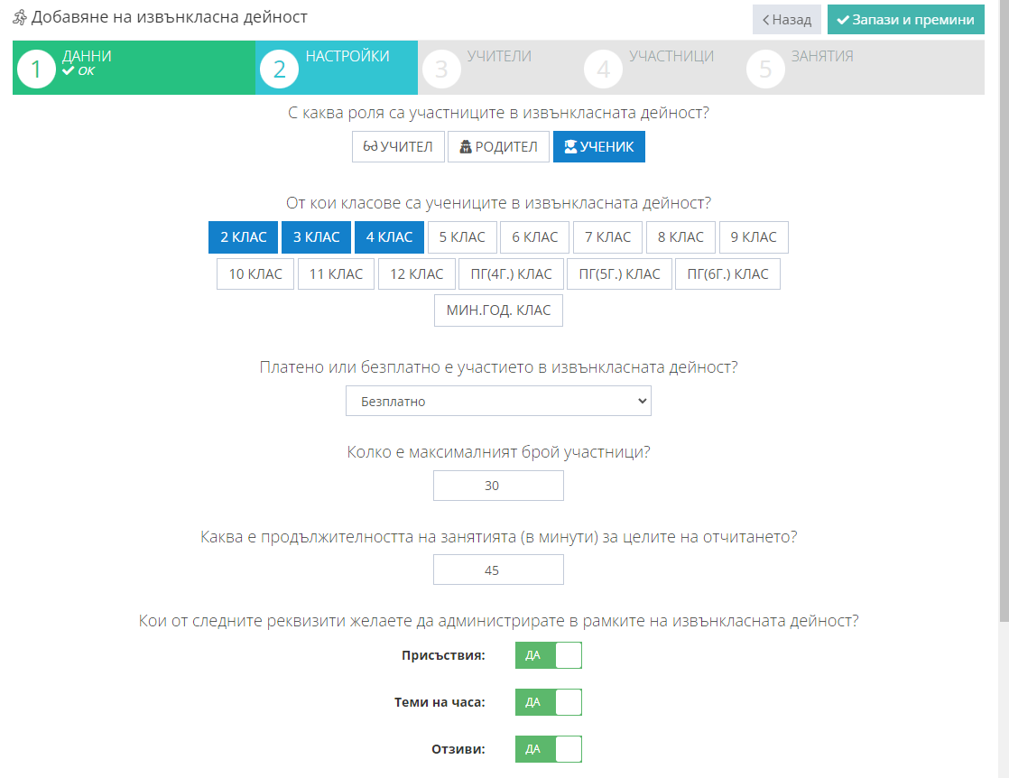 5. На следващата стъпка трябва да посочите кои могат да бъдат участници в съответната извънкласна дейност, информация относно продължителността, дали е платено участието, както и реквизити, които желаете да администрирте. Когато сте готови кликнете бутон "Запази и премини".