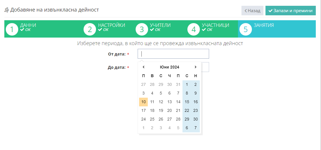 8. Изберете начална и крайна дата за провеждане на извънкласната дейност.