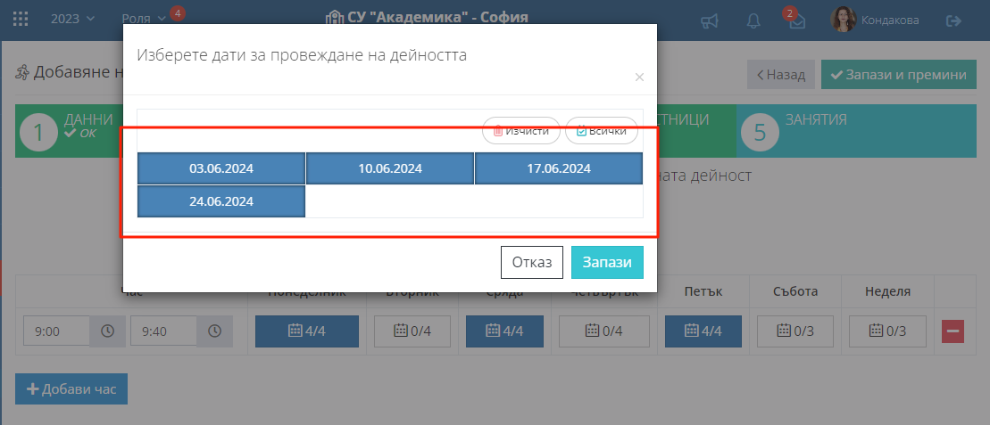 9.2. След това може да посочите дните, в които ще се провежда извънкласната дейнсот. Кликватевърху деня от седмицата и избирате съответните дати.