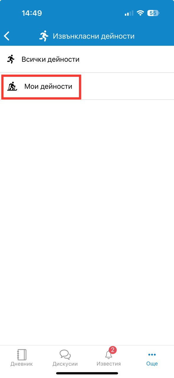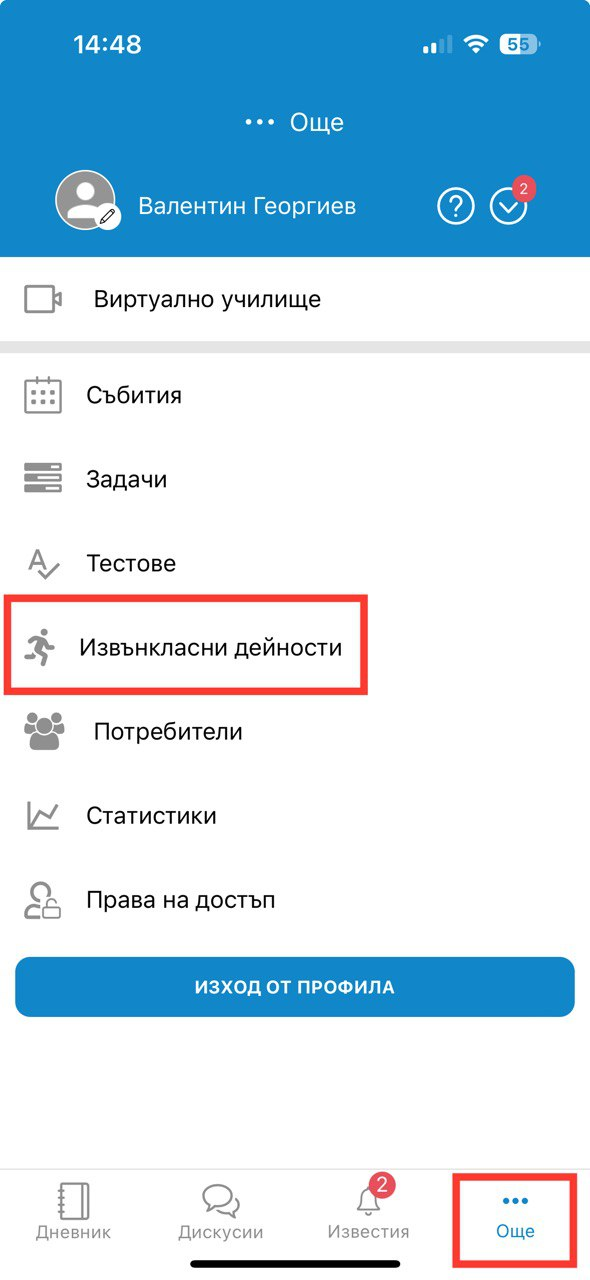 1. Навигирайте до Вашето мобилно приложение, изберете секция "Още" и кликнете "Извънкласни дейности".