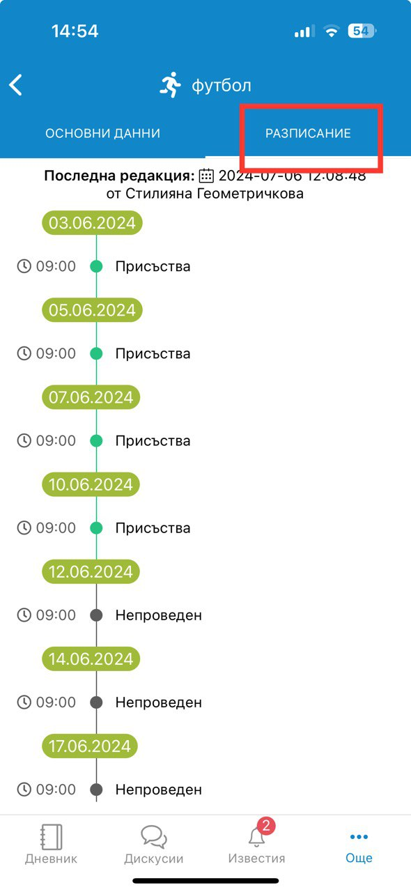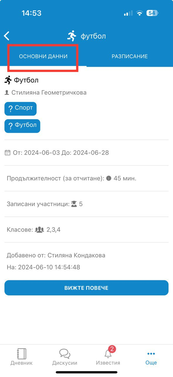 4. Можете да видите основните данни, както и разписанието на дейността.