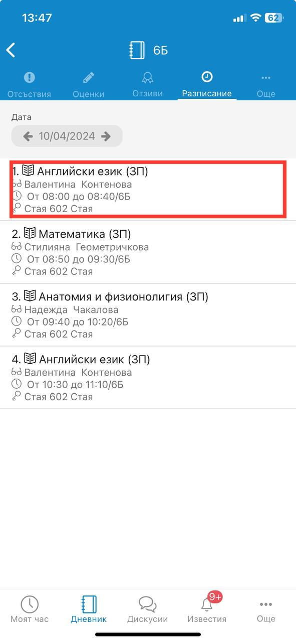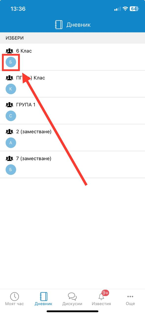 1. Навигирайте до Вашето мобилно приложение, изберете секция "Дневник" и кликнете класа, на който искате да видите разписанието.