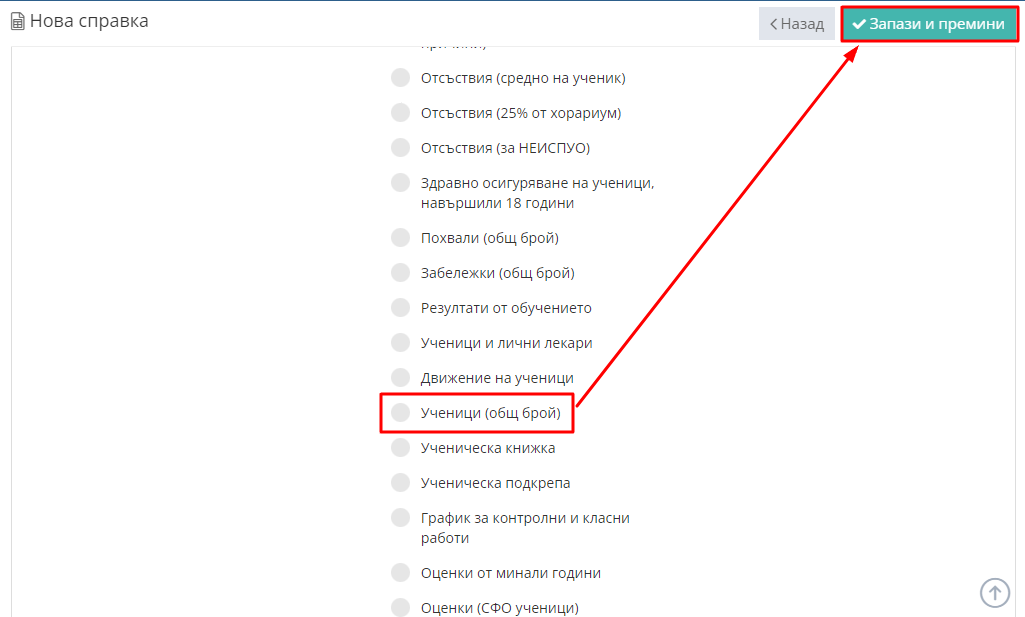 3. Изберете "Ученици (общ брой)" и кликнете бутон "Запази и премини".